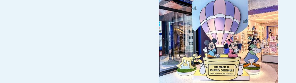 30周年ラストの最新グッズはカラフルな気球がモチーフ。フラッグシップ東京のエントランスにも、グッズに描かれた気球とミッキーたちが期間限定で登場!特別感いっぱいの写真が撮れるはず♪
